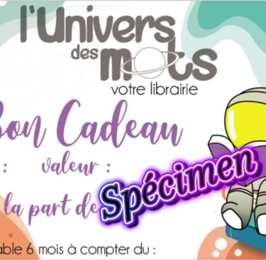 Parce que nous, à l’Univers des mots, on a un coeur gros comme ça, on vous offre à vous ET à la personne qui recevra le bon cadeau des points fidélités (les points sont selon le montant du bon et pourront servir à un futur achat de livre(s) d’occasion). Et la personne détentrice du bon aura automatiquement 5% de réduction appliqués sur ses achats de livres neufs (par exemple, si vous lui offrez un bon d’achat de 100 €, elle pourra dépenser 105 € en livres neufs).